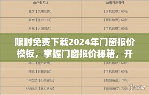 摘要:免费下载2024年门窗报价模板,轻松掌握门窗报价秘籍。该模板助您快速估算成本,提高采购效率,开启高效采购之旅。无论是家庭装修还是工程项目,这款模板都是您的得力助手,助您轻松应对门窗报价挑战,做出明智的决策。