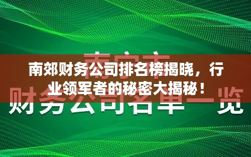 随着经济的繁荣,财务公司在现代商业活动中扮演着日益重要的角色,特别是在南郊地区,众多财务公司如雨后春笋般涌现,为各类企业提供全方位的金融服务,本文将为您揭晓南郊财务公司前十排名,带您了解这些行业领军者的成功秘诀。