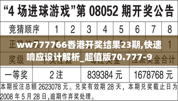 在当今快速发展的社会中,彩票成为了许多人日常生活的一部分,香港彩票因其高额奖金和公正性而广受追捧。在这篇文章中,我们将重点探讨香港彩票开奖结果的重要性,特别是针对最近一期的“ww777766香港开奖结果23期”,并分析其在快速响应设计方面的出色表现和超值版70.777-9的使用价值。我们的目的是为了帮助彩民更好地理解开奖结果,提高中奖概率,并加快信息反馈的速度。