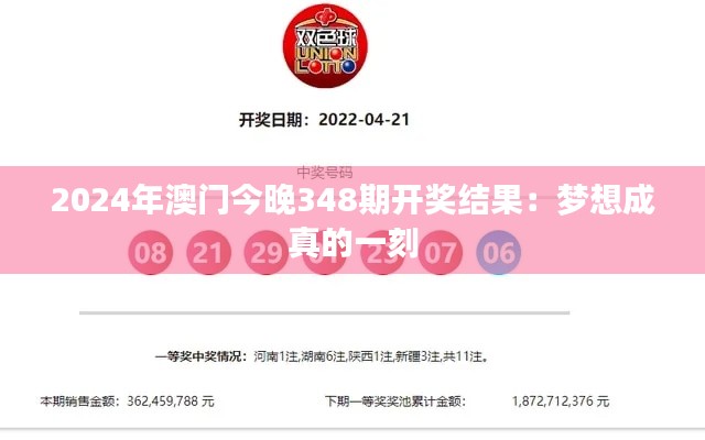 随着2024年澳门今晚348期开奖结果的揭晓,澳门彩票业的未来依然充满希望,这次事件不仅是对过去的总结,更是对未来的展望与期待,澳门彩票将继续推动行业的发展,为更多人提供实现梦想的机会。
